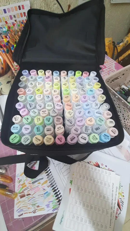 Chaque set est livré dans un sac de transport élégant, avec capuchons codés par couleur, carte d’échantillons et feuille anti-transfert.